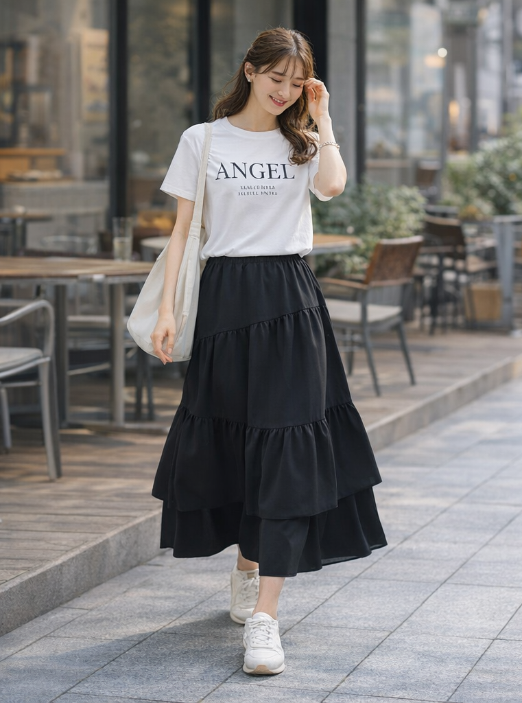 ティアードスカートはフェミニンな印象がありますが、Tシャツやスニーカーと合わせることでカジュアルな雰囲気になります。