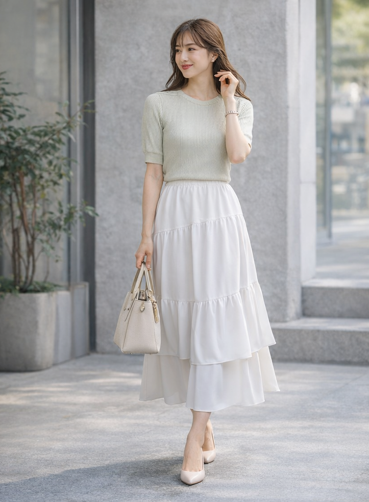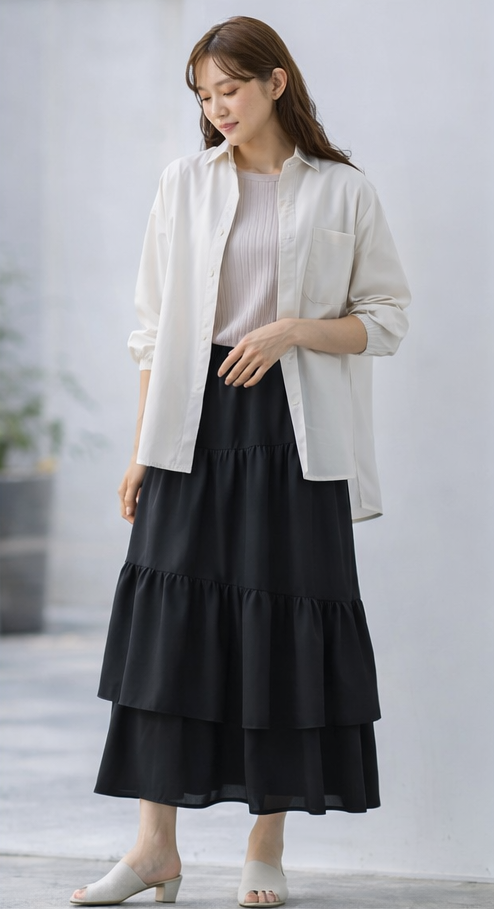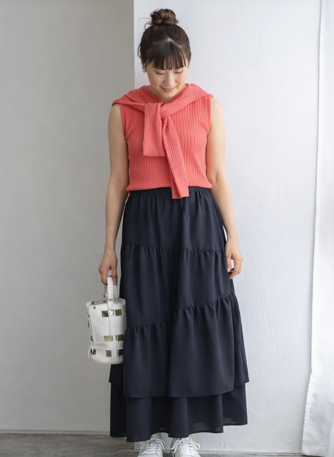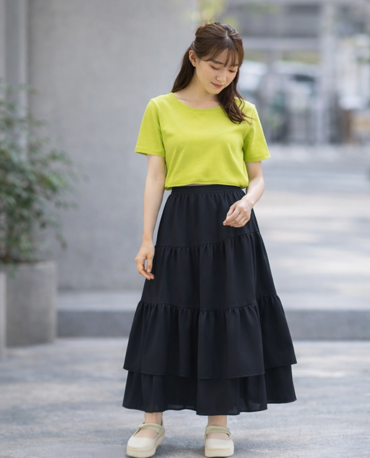 ヒップや太ももが気になる人には、ティアードスカートは比較的取り入れやすいアイテムです。