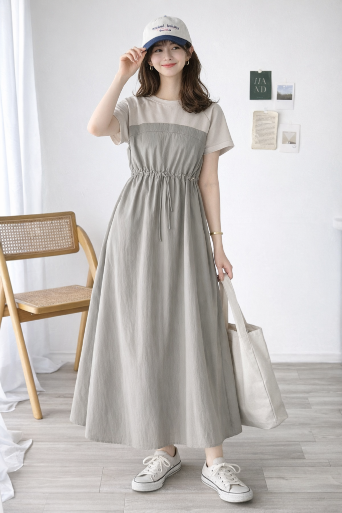 ✔ ビスチェ風ワンピ × スニーカー × トートバッグ