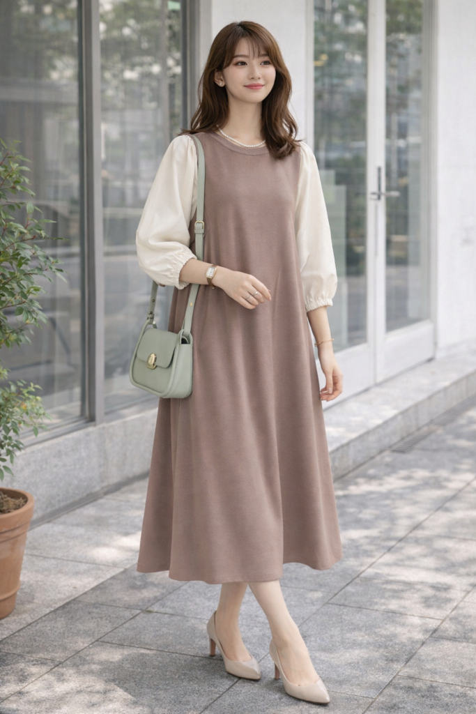 ✔ ボリューム袖ワンピ × パンプス × 小さめバッグ