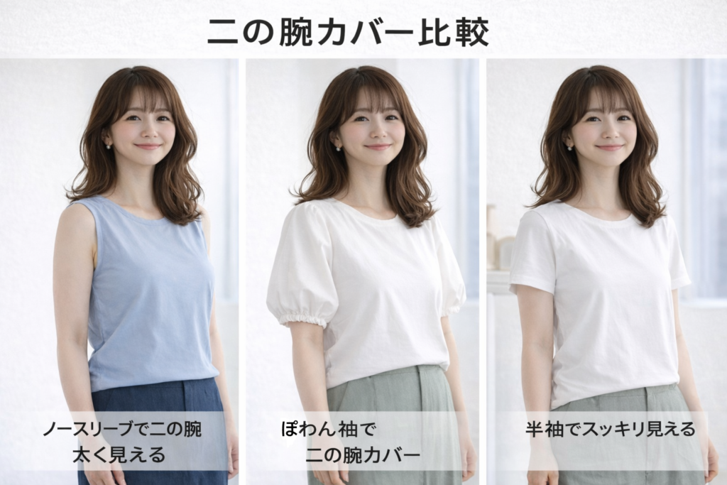 ノースリーブ・半袖・ぽわん袖では、二の腕の見え方が大きく変わります。