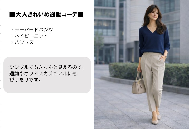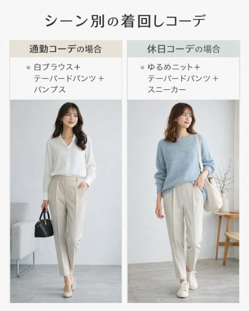 テーパードパンツは、通勤・普段着・きちんとシーンまで使える万能アイテム。