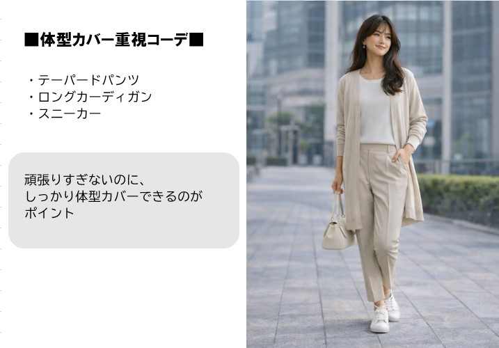 40代は「体型カバー」と「上品さ」のバランスを意識するのがポイントです。