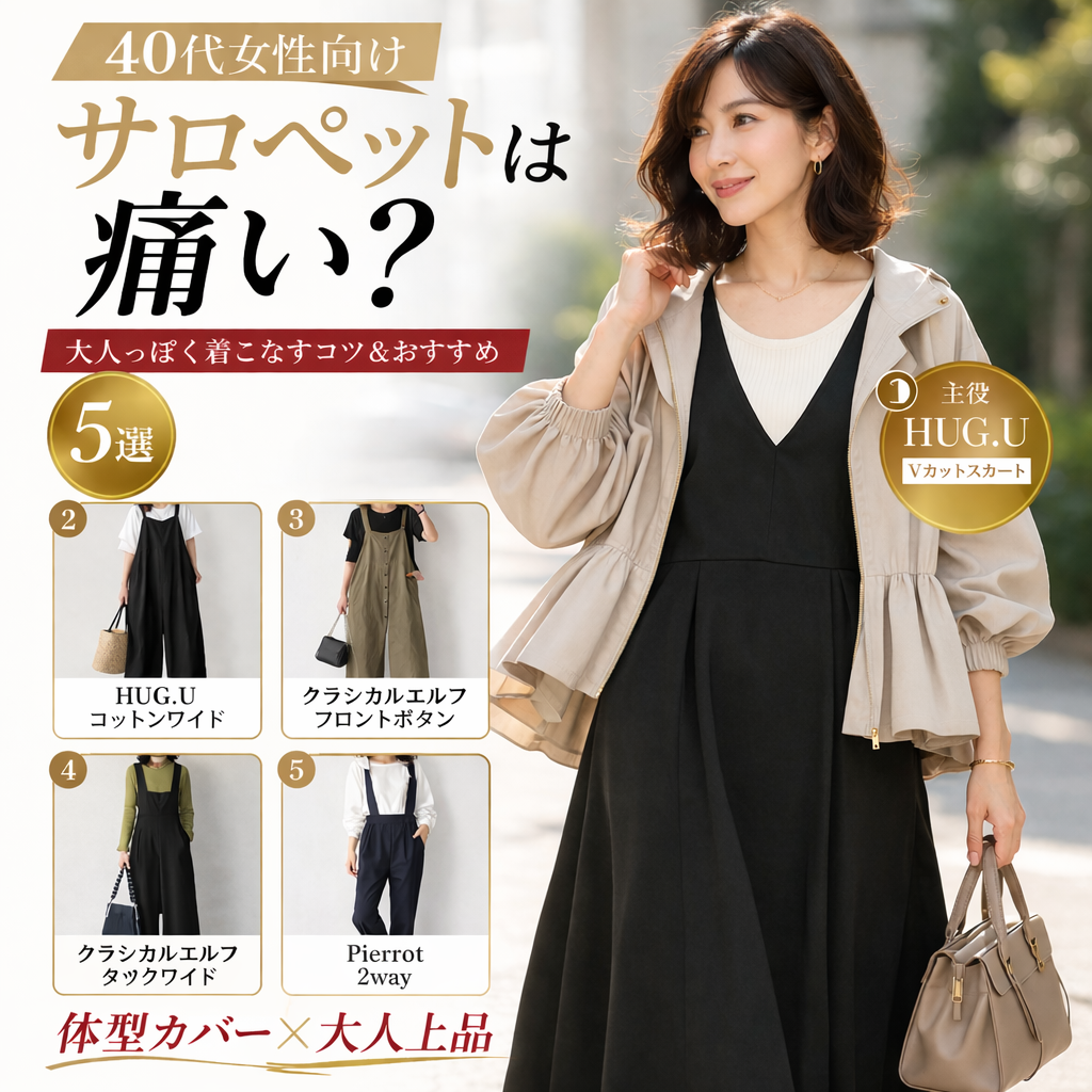| ① HUG.U Vカットサロペット | 深Vでスッキリ 細見えシルエット | ★★★★★ | 迷ったらこれ |